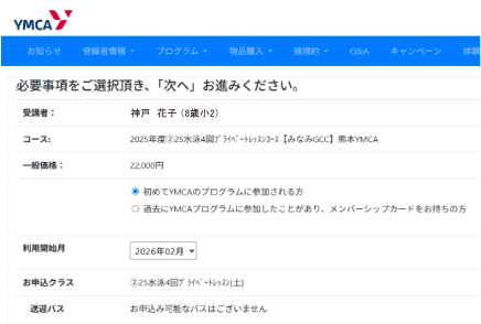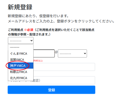 | ※注意ポイント! ご利用拠点は必ず「神戸YMCA」を選んでください |