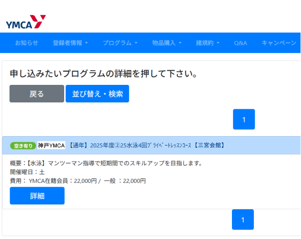 | 3.参加できる対象年齢のプログラムが表示されます。その中からお申込みいただくプログラムの「詳細」をクリック。 |