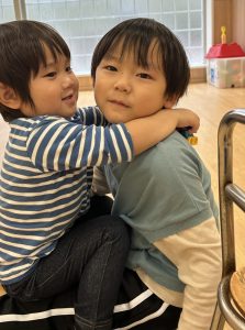 先輩たちの姿を見ながら、何度もトイレに挑戦しては、失敗して着替え、また挑戦して、少しずつ出来る様になっていきます。トイレが成功すると自分でできたことが嬉しくて、満面の笑み!そしてどんな小さなことでもお友だちとリーダーがみんな一緒に大きな拍手し喜びます!!