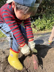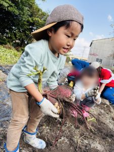 お芋畑では、昨年の経験を活かしすぐに土を掘り始める子、初めての子はお砂遊びからのスタートです。お芋が見えてくると、どの子も目を輝かせて手にも力が入り「よいしょ‼よいしょ!」と動きが速くなっていきます。はじめはお芋を撫でていた手が土をよけるようになり、周りで芋を引いた歓声が聞こえだすと更に盛り上がり力強さが増していきました。