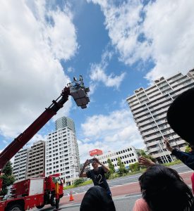 壁や天井に設置されている道具を見渡して車内を満喫。そんな子どもたちを外で待っていたのははしご車です。目の前ではしご車のはしごが伸びる伸びる!子どもたちは、高く高くどこまでものびていくはしごを限界まで顔を上げて追います。