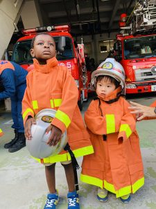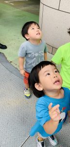 夏以降に仲間入りしたお友だちは初めての野外活動。行きのバスの中で「消防署いこうね!」と声をかけると「ウーカンカン」と消防車の音マネで返事をしてワクワクした様子でした!