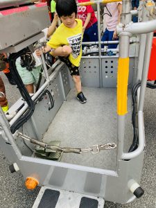 やっと子どもたちの目線に降りてきたはしご車のバスケット部分に今度は乗る体験です。バスケットの出入口には落下防止のためにチェーンがあります。子どもの股下くらいの高さのチェーンを自分でまたいで越えていく子どもたちのスムーズすぎる動きになんと隊員さん達がびっくり!普段の体育プログラムで培った力をこうした日常場面で発揮出来る子どもたちが本当にすばらしいなと感じた瞬間でした!